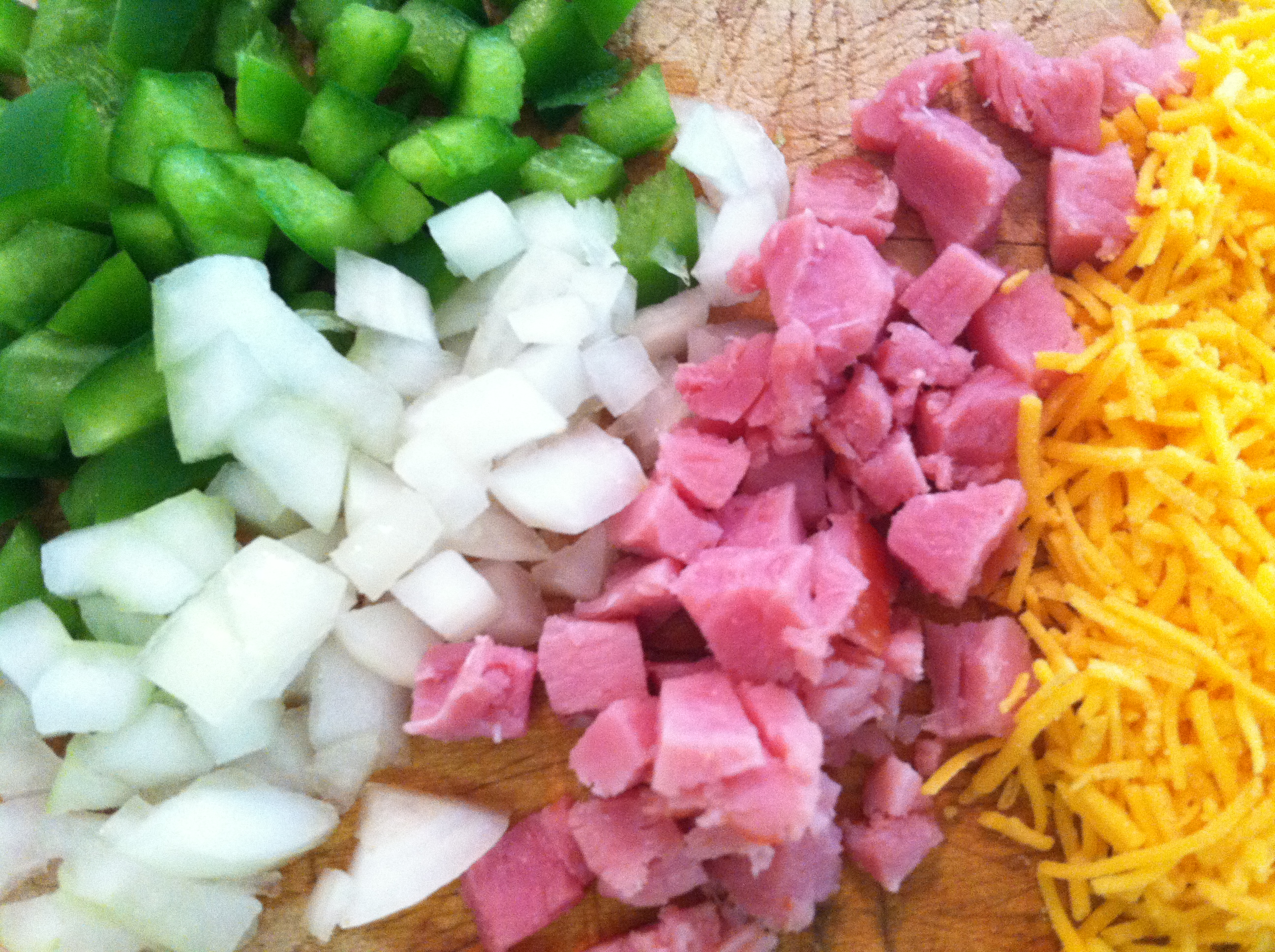 I started off by chopping yellow onion, green peppers, Boar’s Head ham (the best), and some cheddar cheese.