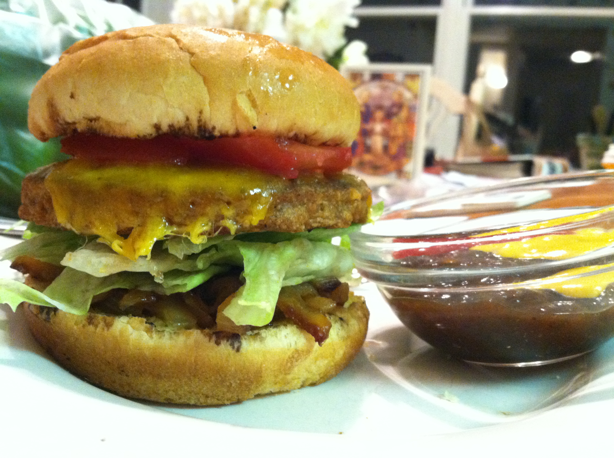 I had to work later than usual tonight because of the Hawks game but when I got home I walked through the door and was met with a kitchen table full of food! My family had barbequed while I was gone so there was so much grilled goodness! I enjoyed a delicious grilled veggie burger complete with cheddar cheese, grilled onions (my favorite), tomatoes, and lettuce. I attacked a bowl of watermelon as well–it was the perfect summer meal.