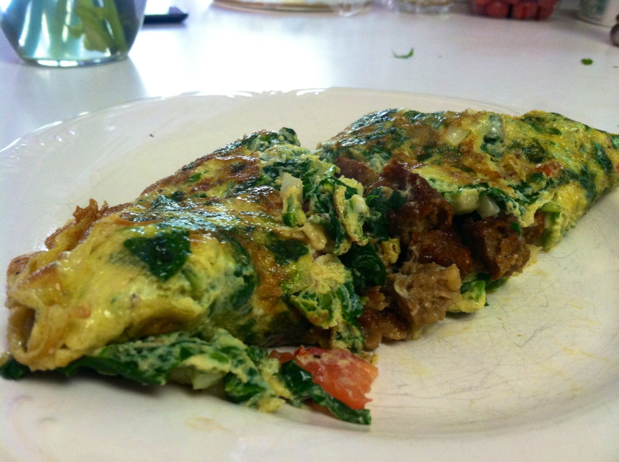 2 eggs, tomato, onion, spinach, and 2 veggie sausage patties.