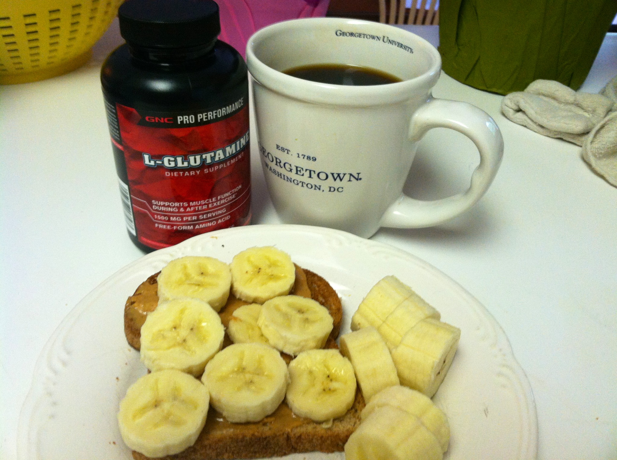 Post-workout breakfast was pb/banana toast with coffee, plus 2 glutamine pills and protein powder/almond milk. I think this breakfast is perfect for the day before a race! I feel totally fueled for the day.