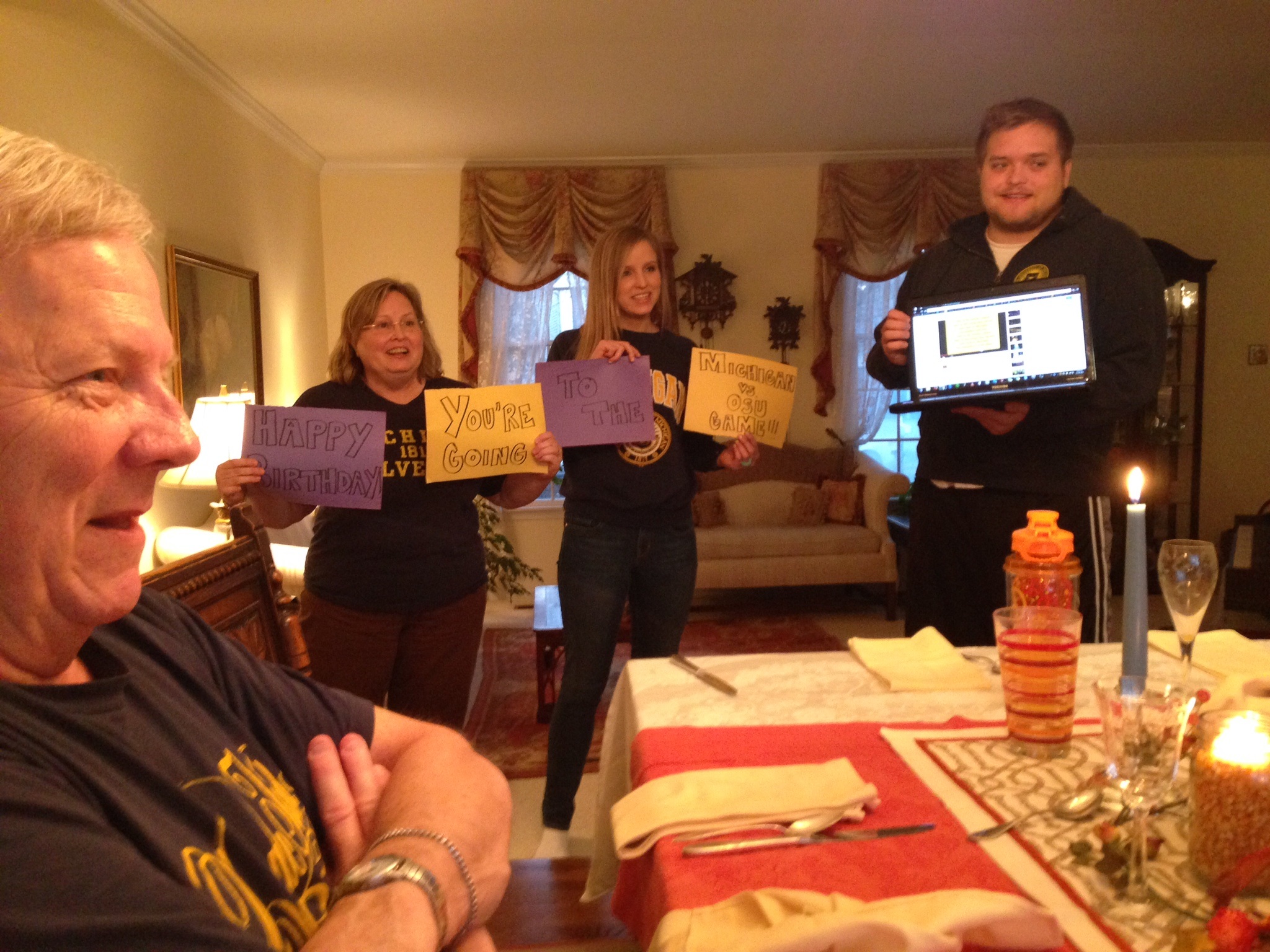 Luckily the pain pills made me loopy enough to still enjoy the turkey day feast. I even left the house once this week for a magical trip to TJs! Yesterday was a great day filled with cranberry goat cheese, scalloped butternut squash, and mimosas (virgin for me and my friend oxycodone). We also surprised my dad with his 60th birthday present — tickets to the Ohio State vs. Michigan game this weekend! He had no idea and is so thrilled! It was fun to pull of such a huge surprise. We all ended the day like we always do–passed out on the couch. Success!