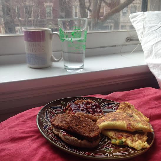 I came home ravenous (coffee in my stomach without food is no bueno) so I whipped up an egg sandwich: two eggs, peppers, cheddar cheese, Morningstar sausage, and raspberry jam on a whole grain English muffin.