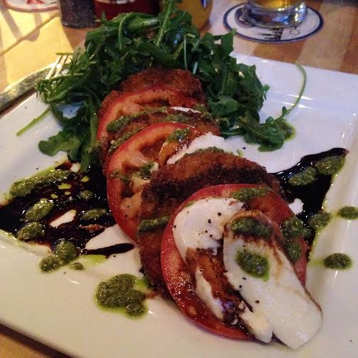 Fried Green Tomato Salad: arugula, mozzarela, tomatoes, and fried green tomatoes with pesto and balsamic