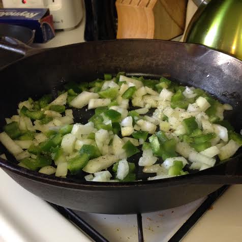 - When oil is hot, add onion and pepper to the pan. Let cook over medium heat for 3-4 minutes. Add garlic and chopped spinach.